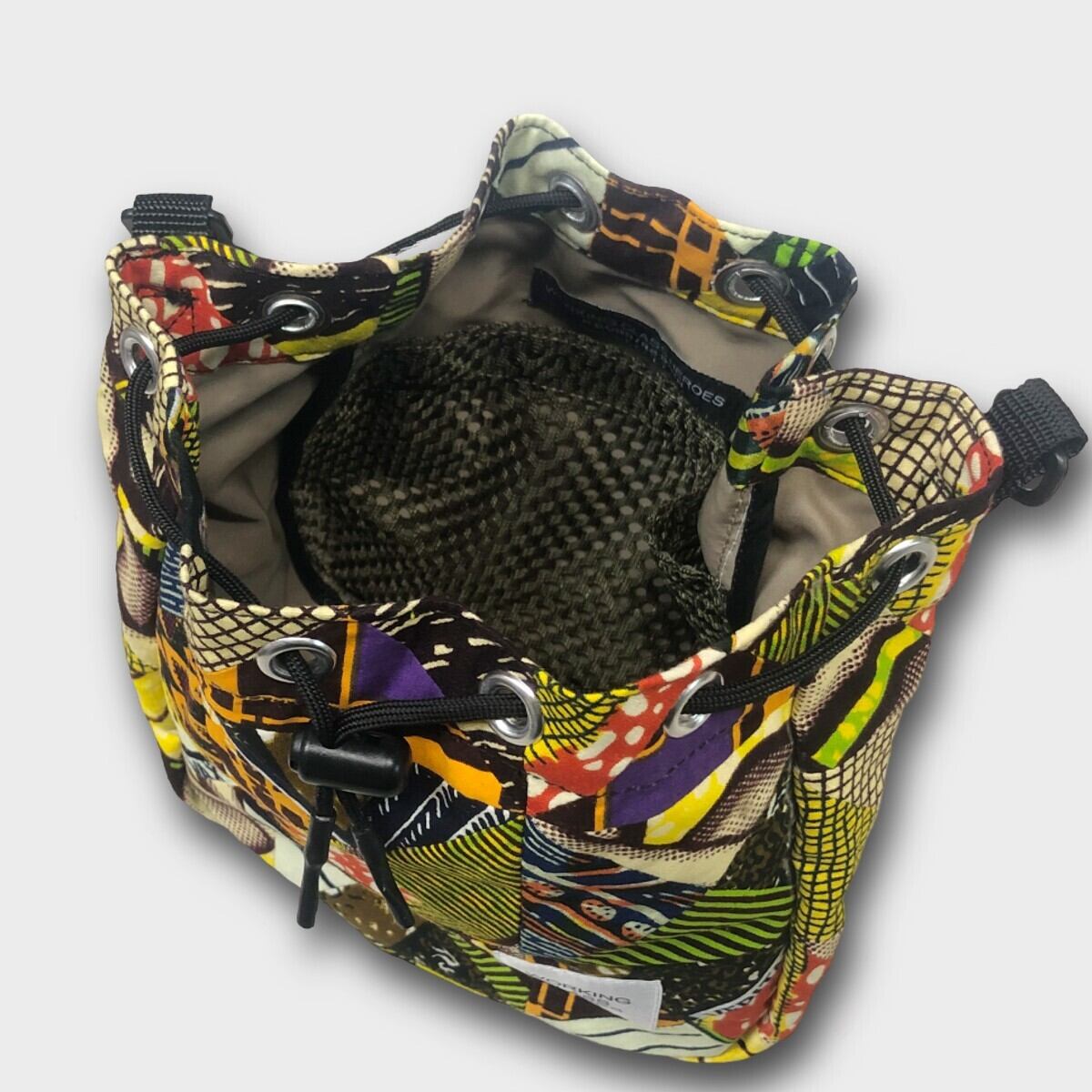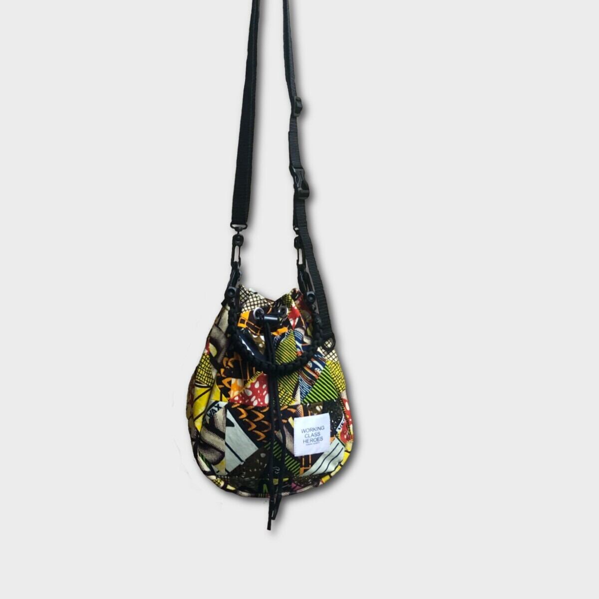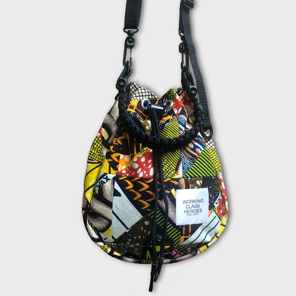 様々な柄のアフリカンバティック生地をパッチワークした"Drawstring Poach" 2wayで楽しめる巾着ポーチ。